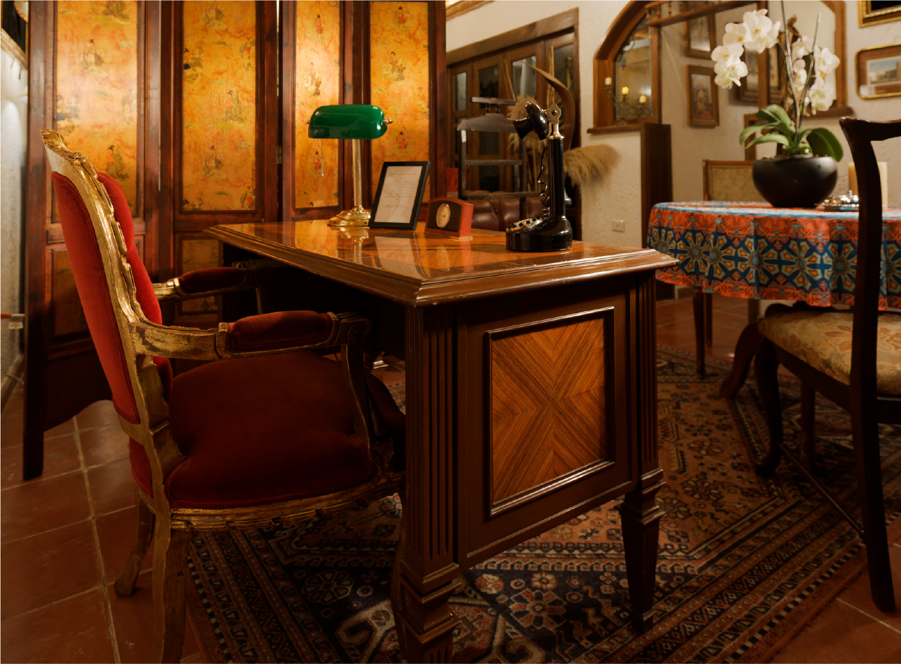El estudio inspirado en la época victoriana de finales del siglo XIX transporta al huésped a un descanso, al trabajo no sistemático, no abstracto, más bien literario, de la palabra escrita, la luz de una lámpara de “banquero”, será su compañía mientras se deslizan las ideas con el correr de los minutos, sino de las horas. eternidad»
